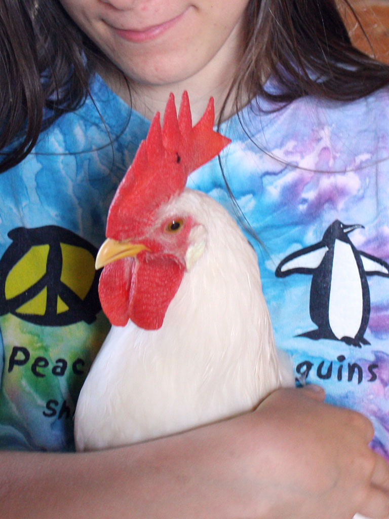Some young hippie with a leghorn rooster.