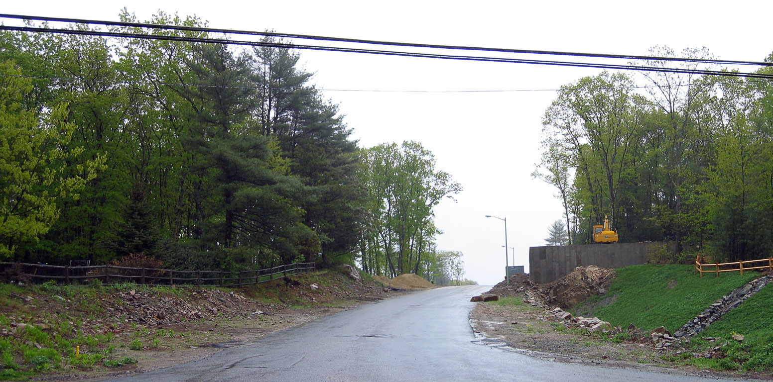 On the right side, beyond the retension pond, is this god-awful 12' high concrete retaining wall. That's a full-size back-hoe perched on top. When it's done it's work, and the ground inside is filled and leveled, what do you suppose is going to perch there next? My guess is a god-awful house to match, looming over, well, everything.