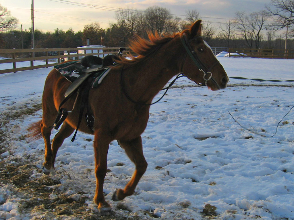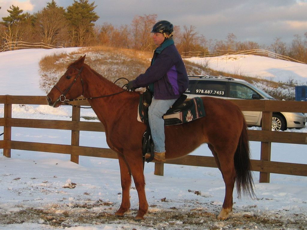 18 year old quarterhorse mare. A little nervous, but not at all spooky; interested in everything that's going on. Good mover, nice gaits, very energetic, but never out of control, and good brakes. Extremely responsive - just think "go" and she goes. Attentive to voice, hand, leg, and seat cues.
