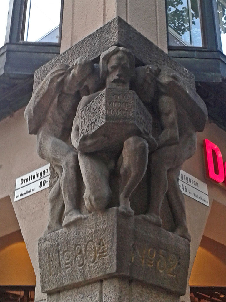 Let's start with the most elaborate street sign evar. The stone that the central figure is holding reads "Drottninggatan" (Queen Street) on one side, "Kungsgatan" (King Street) on the other side, and in the center, something like "QV Vinklehaken", where a vinklehake is a type of mason's square. (Apologies for the quality of the phone-cam pic. I was walking from the train station to my hotel, and I should have busted out the good camera right then and there.)