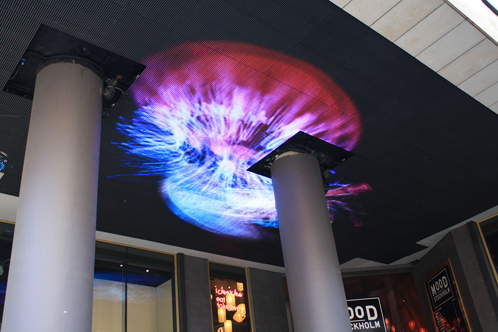 LED display on the ceiling of the entrance to a mall/office building.