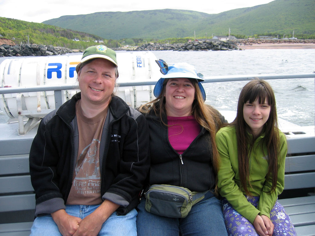 Driftwood Lodge, Ingonish. We picked this at random from the listings in the Nova Scotia tourism book (partly influenced by "no television" and "cats on premises" in the description). The freaky thing is that we stayed here on our honeymoon, 20 years ago, also pretty much at random. At the time, there was a Polish restaurant in the pink building on the right, and we were hungry, tired, and intrigued. The grand-daughter runs the place now, but she seems to be bringing up her kids (toddler and infant) in Polish. Also coincidentally, the Salty Bear adventure tour group that pulled in after us was also on the whale watch, on the other side of Cape Breton, 50 miles and 5 hours back.