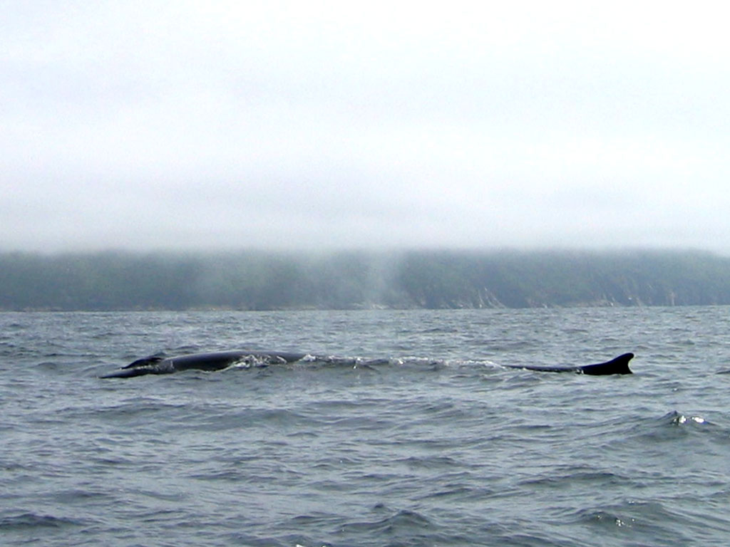 Fin whale, surfacing to breathe. The blowholes are just visible at the left, dorsal fin at the right. These are the second largest whales (second largest living animal, really), after the Blue Whale. We saw two Fins and three Minkes, but we were never close enough to the Minkes to get a photo.