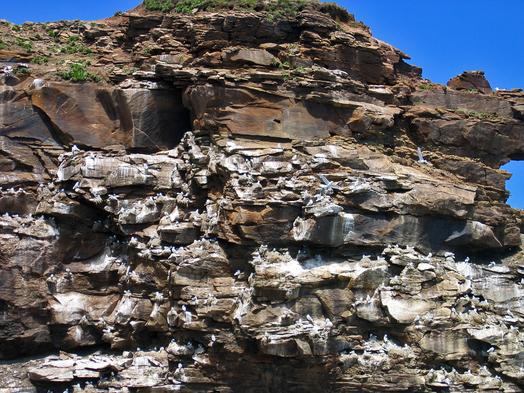 Kittiwakes nesting on the cliff face.