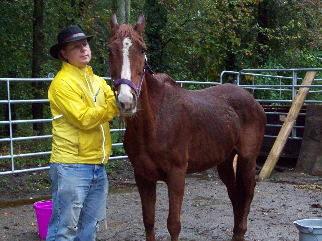 In any case, he has no circulation to the left hind leg, he can't move it, and he's just standing in the paddock, occasionally rotating around the hind legs, even more occasionally dragging himself a few feet, as when he felt beset by the other horses (he was getting treats, and they wanted some of the action). He's probably getting put down tomorrow morning, but I'll be on a plane to California by then. So I stood with him in the rain for 4 hours this afternoon, feeding him treats, grooming him, singing to him, and generally saying my goodbyes.