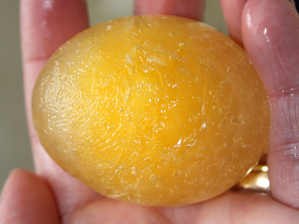 The other day, we missed collecting this egg, and it froze. Francie carefully peeled it.